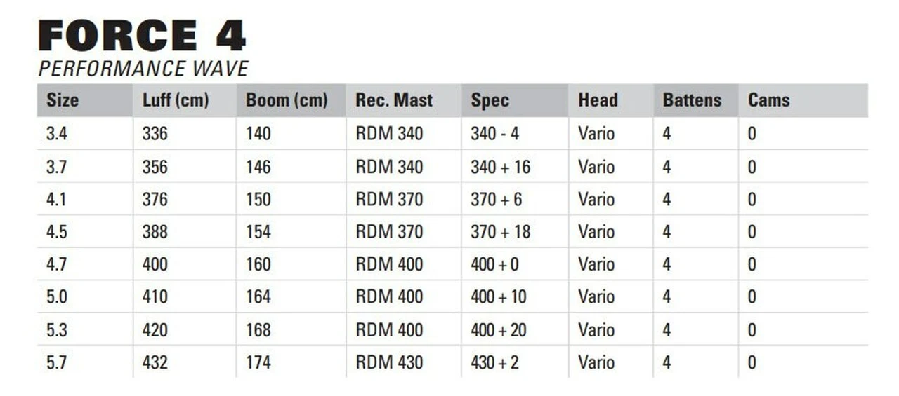 The Force 4 builds on the legacy of Naish four batten wave sails. Naish’s purest wave sail delivers stellar performance in a wide range of conditions – onshore, sideshore and offshore – but is at it’s best down-the-line. The draft-forward shape and moderate aspect ratio give the perfect balance of power and responsiveness and provide an “in-between-the-hands” feel that makes it exceptional for both wave riding and freestyle. Durability is engineered into every seam and detail, and validated at Hookipa, our primary testing ground. The Force 4 is our cutting edge wave sail, ideal for a wide range of progressive riders due to its light weight and responsiveness.