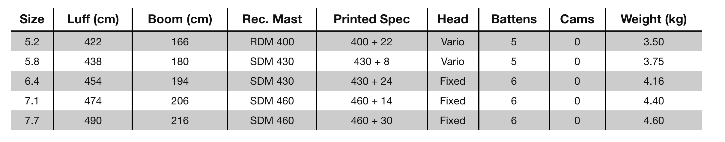 The Sprint is our no-cam freeride sail which offers great performance and easy handling. The smaller sizes feature 5 battens and are optimized for control and maneuverability. The larger sizes of the Sprint feature 6 battens are optimized for speed and power on larger freeride/slalom boards. The Sprint sets the standard for freeride performance with its early planing, balanced feel, and high-quality construction.