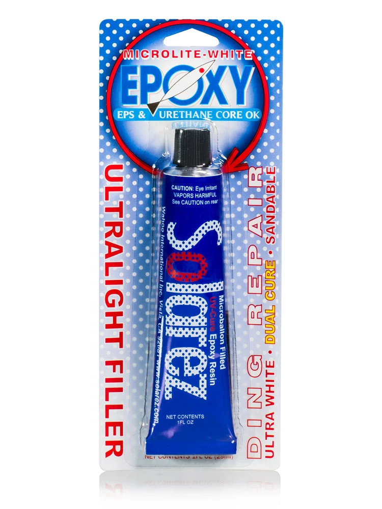 It is a white putty made of high-strength UV-Cure resin and super lightweight additives that effectively repair ALL TYPES OF SURFBOARD FOAM, including Styrofoam. This putty cures in roughly 3 minutes by exposure to sunlight or artificial UV light. It sands and fairs very nicely, making it an easy one-step repair for almost any ding.