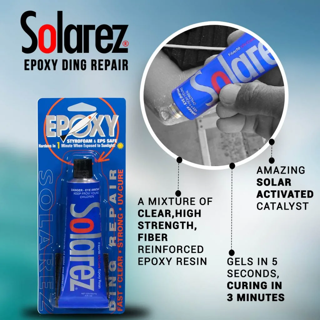 SOLAREZ Epoxy repair putty is a mixture of clear, high strength, fiber reinforced epoxy resin and an amazing solar activated catalyst. There is no mixing required, just use it right from the tube. It gels in 5 seconds, curing in 3 minutes – but ONLY when exposed to sunlight.